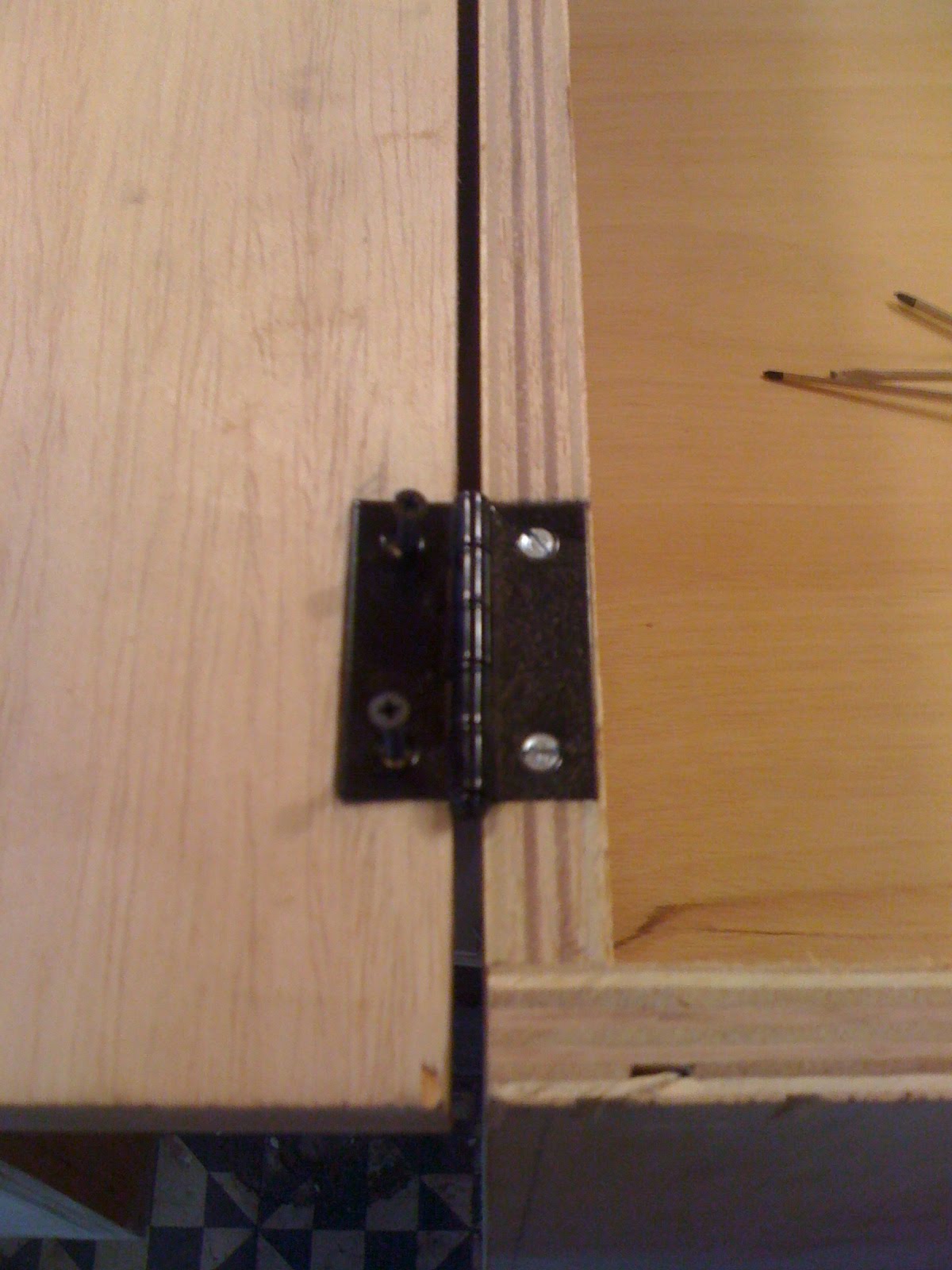 No dia seguinte passei na Paes Lemes para comprar uns parafusos de aço e maiores para poder segurar a tampa. Chegando na marcenaria fixei as dobradiças e fui ver como ficaram os encaixes, sobrou um pouco dos lados e faltou um filete do outro.